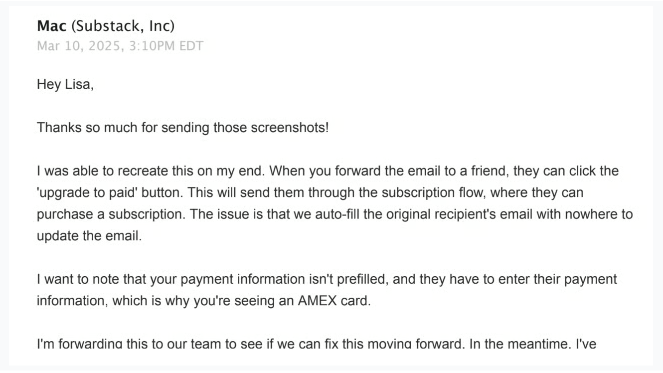 I got a DM on Substack from Lisa who forwarded a Substack newsletter to her friend. Her friend upgraded to paid. But, Lisa got the upgrade alert. She noticed her Substack account was tied to her friendâs credit card and future upgrades would all be charged to her friend. At least 3 people reported this happened to them in a Reddit thread. Itâs happened to Lisa twice. Absolutely bananas that this isnât fixed yet.
