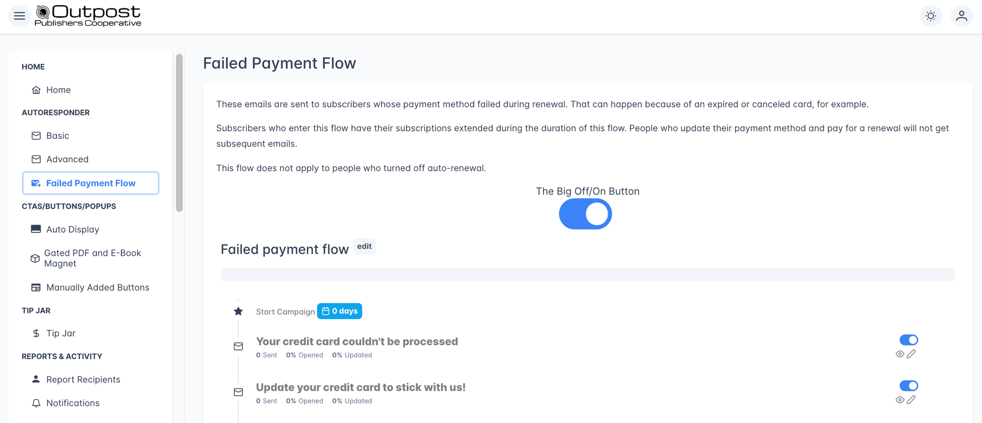 - Failed payment flow: Turn on the Failed Payment Flow. There's already templates in there, but you can turn on as many as you like (I recommend all of them! Get that money back!)