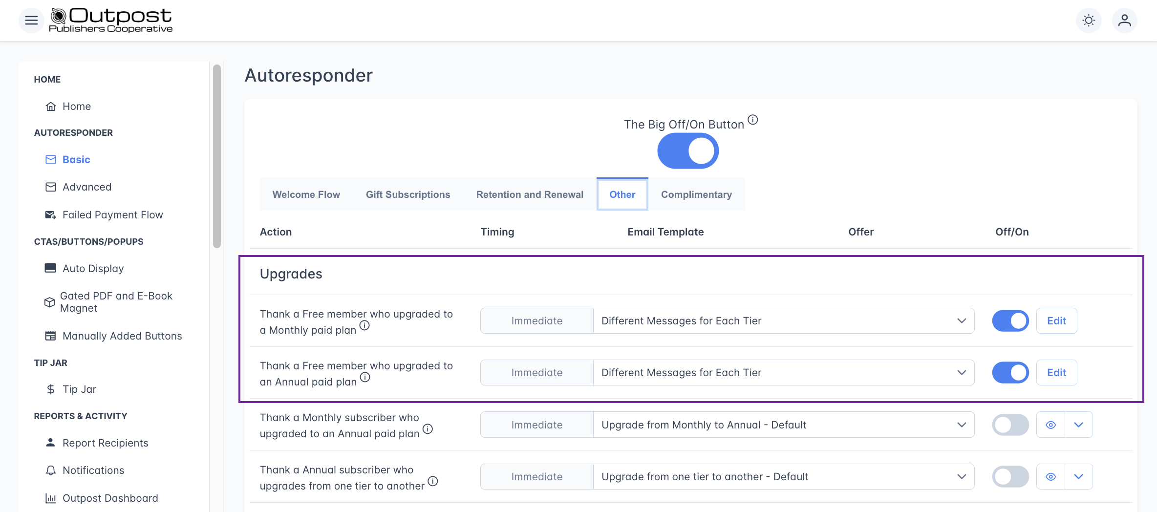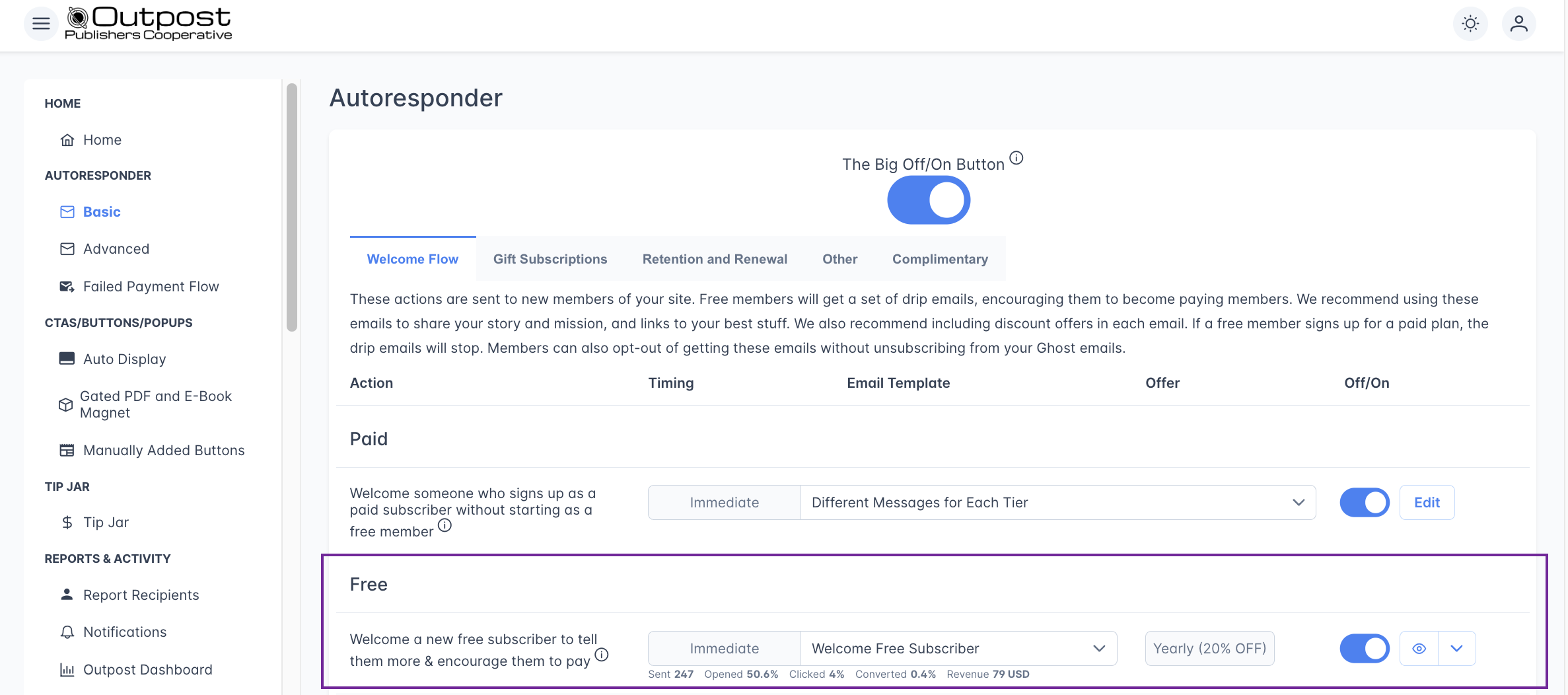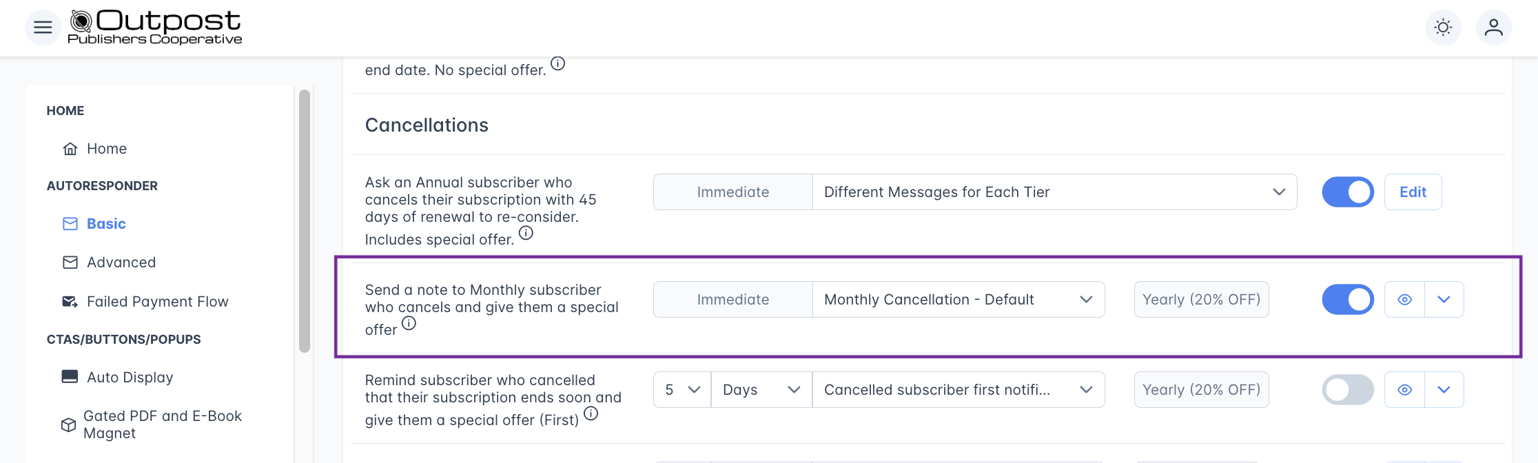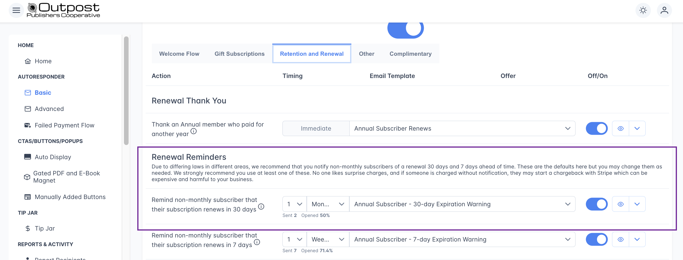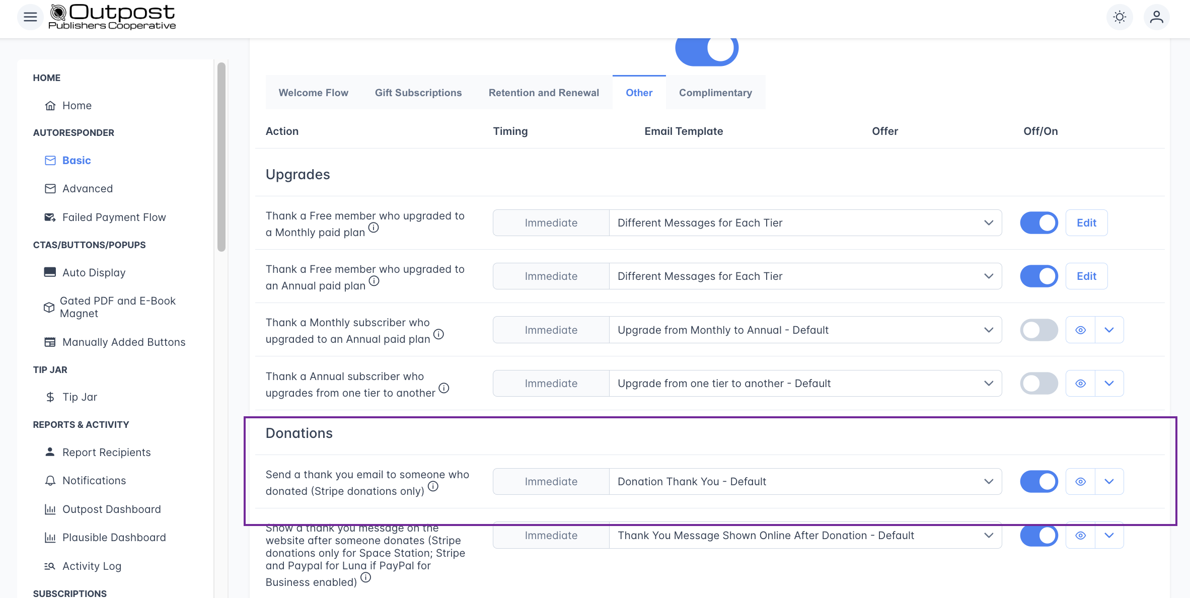 - Retention offer: Outpost co-founder Ryan told me to add this one because it's super effective at getting people to come back. If a monthly subscriber cancels, you can send them an offer to stick around. Edit the template and turn it on! 💡 Pro tip from Ryan: offer them a discount on an annual sub—it works better and brings in more revenue!