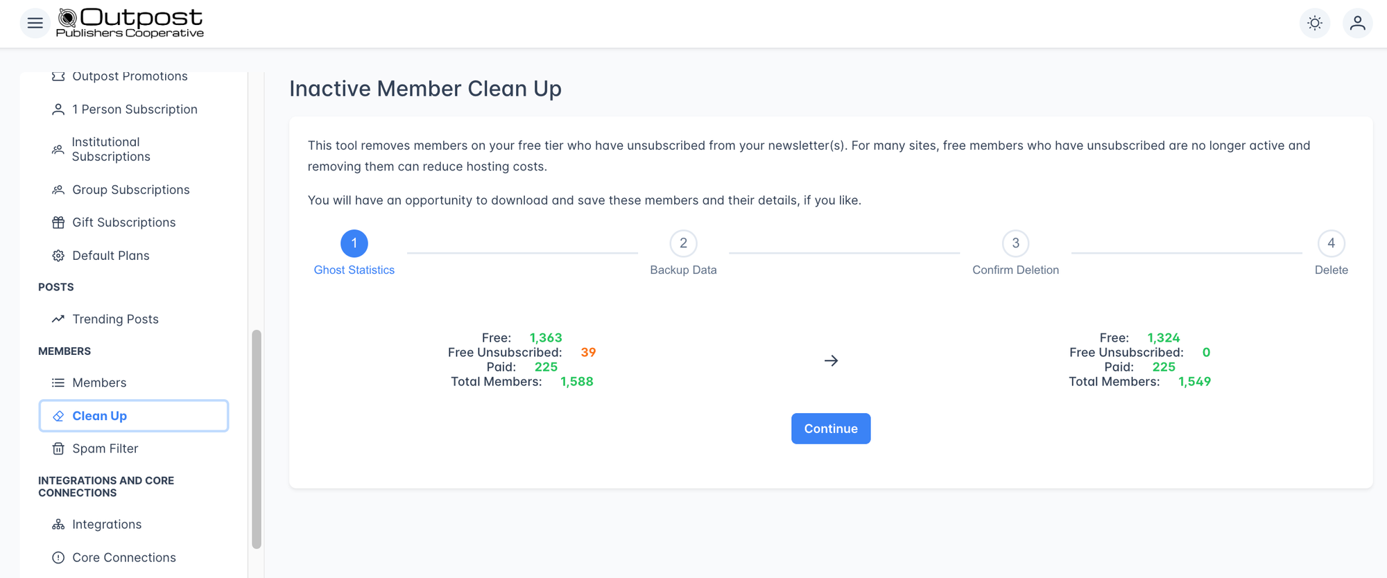 - Member clean up: Use this tool to remove free members who unsubscribed from your newsletter. Ghost charges you for all members, regardless of whether they get your newsletter. Smash the button and Outpost does the rest!