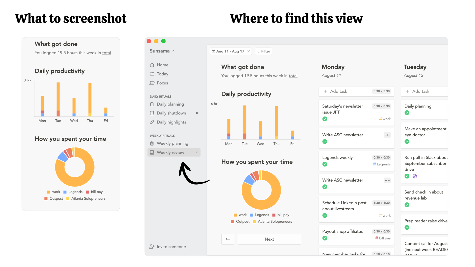 - Take a screenshot of your Weekly Review showing us how you spent your time