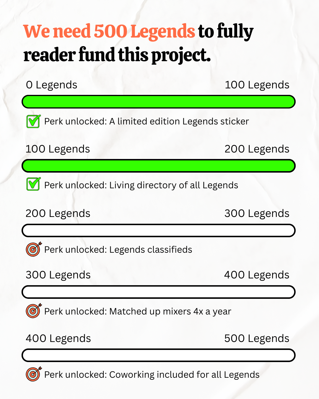 I surveyed The Legends in August 2025 and based on their selections, these are our current new perk milestones. I'm reserving the right to change these (especially the far out ones) as Legends will change based on who joins and I want to stay responsive to changing interests, but this is the current plan: