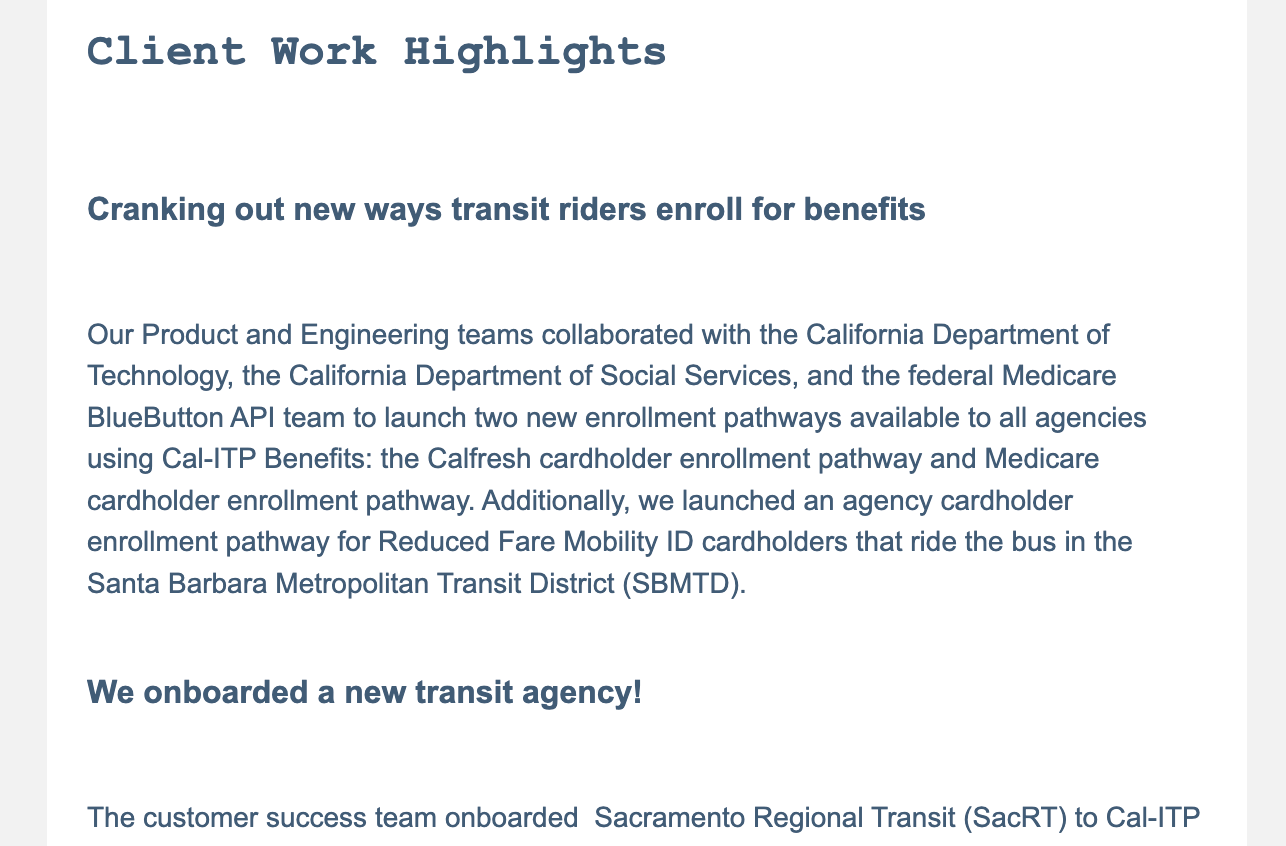 I loved how government tech consultancy Compiler opened their 2024 year in review by shouting out a bunch of their client wins. This is a sneaky good lead gen strategy if you're emailing your yearly recap to your list (where potential clients might read it.)