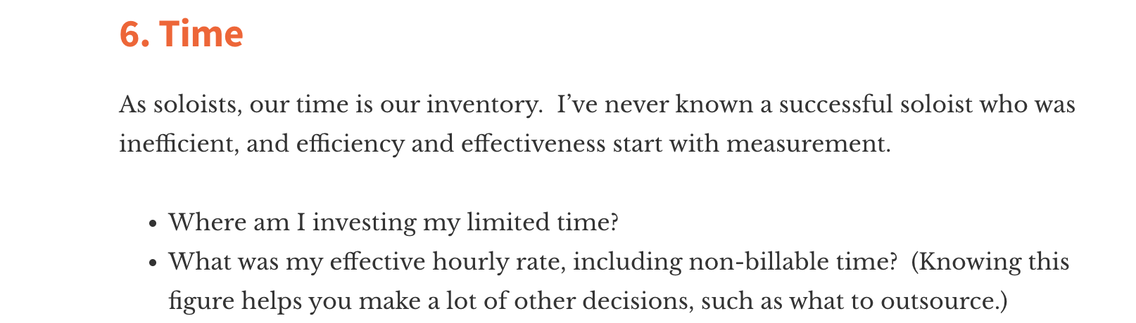 I've run through Matthew's whole process before, which is super comprehensive and I think one of the best end of year (or anytime of year) plans you can find. The section on time includes several questions about what your actual hourly rate is and how much billable (or revenue-generating) time you have per week. You may think you know these answers but calculating them every year is insightful.