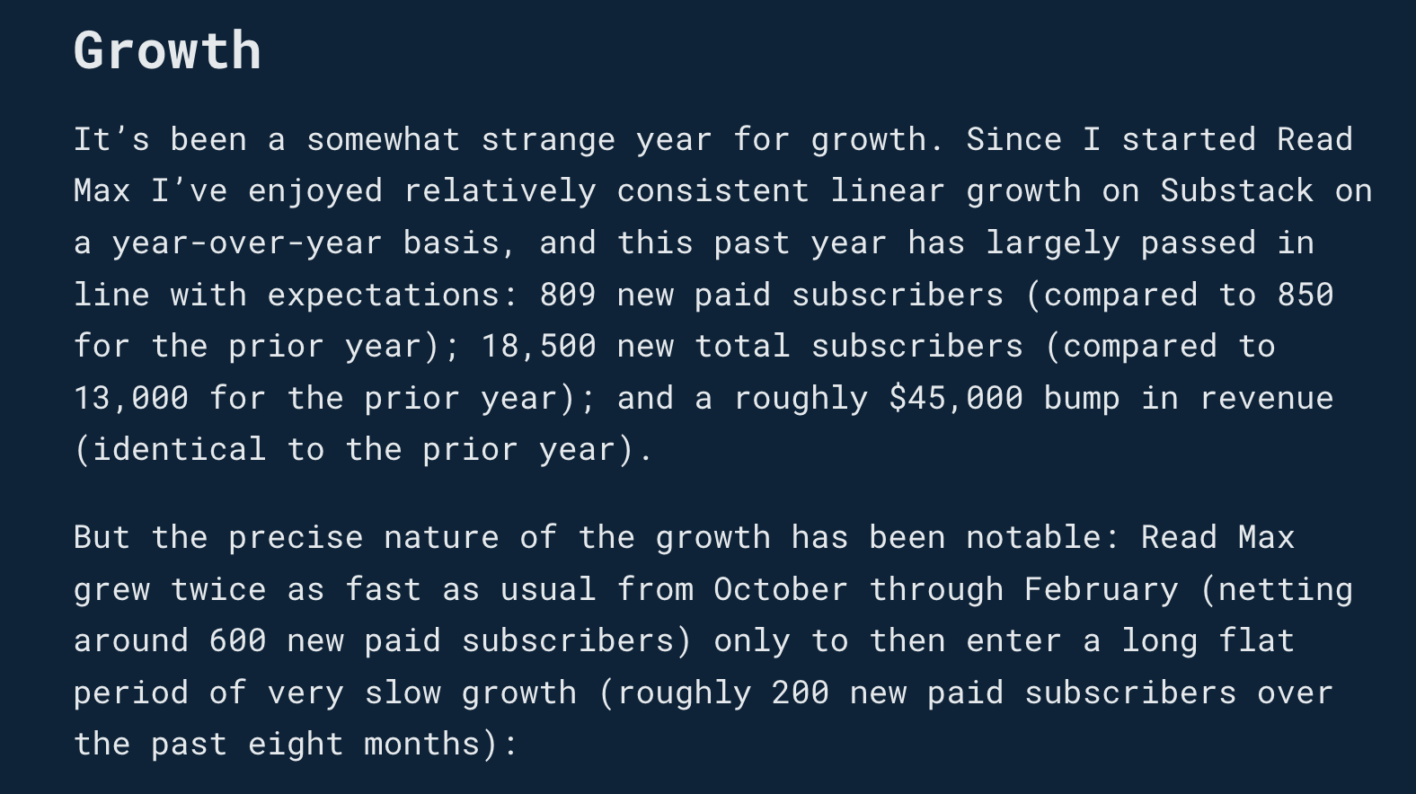 Max Read, who publishes Read Max, ran a year over year comparison of his revenue and paid subscriber count, writing "My longstanding belief, elaborated many times in these yearly reports, is that 'year over year' is the only proper way to judge the growth of a digital-media business"