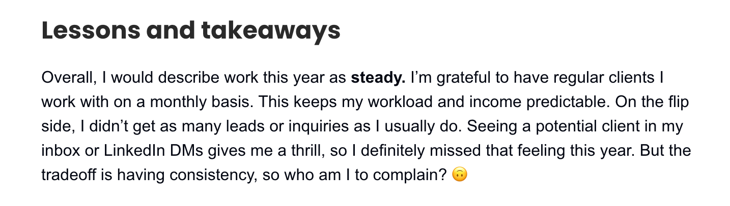 Writer Kara Detwiller put highs and lows in one simple list along with some stats about her year. And lest you think this is just for service providers and creators, tech founder Brennan Dunn from RightMessage included lots of updates about the company in his 2024 review but several personal moments too.