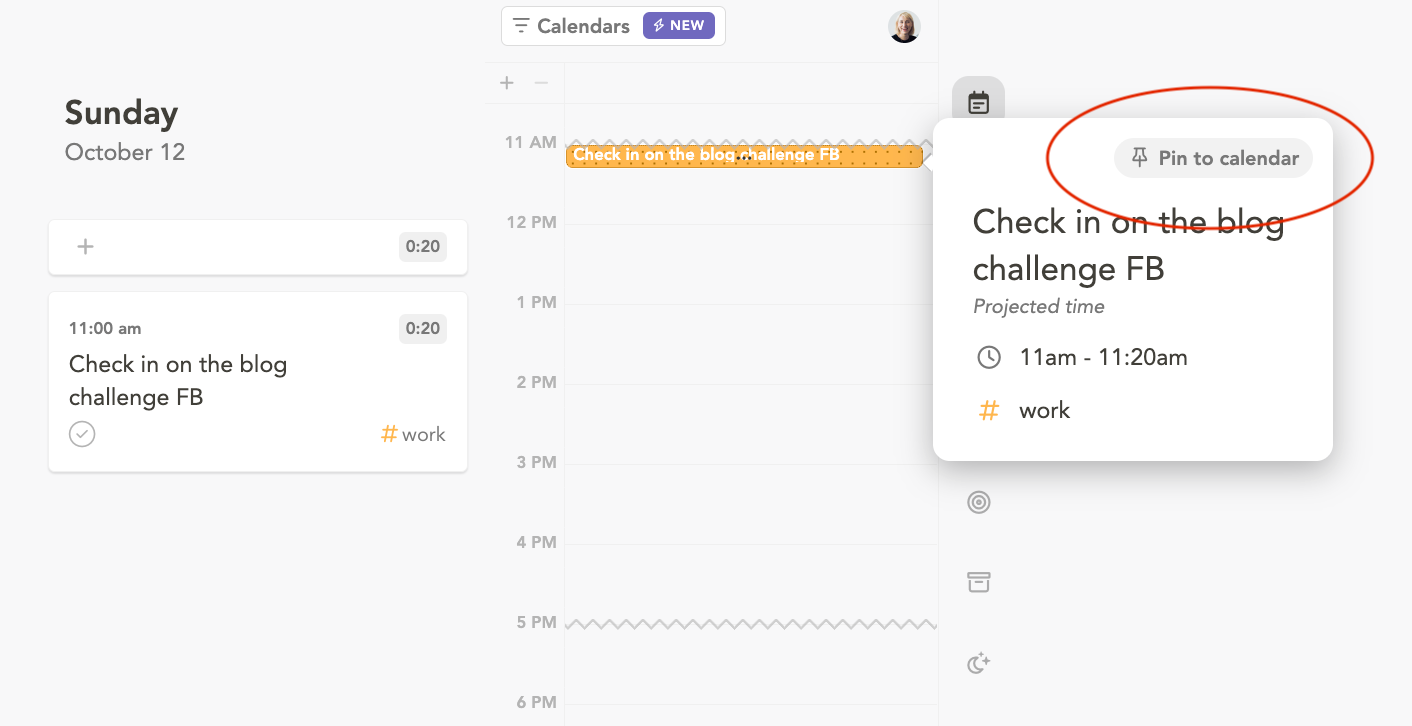You don't have to push these blocks through to your actual calendar—it's just a visualization of how you'll spend your day—but if you do want it on your calendar, just hover over the block they created and click "pin to calendar."